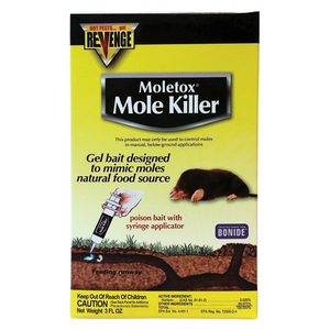 Bonide Moletox Baited Gel provides guaranteed mole control. The bait mimics natural food in taste, smell and texture, making it irresistible to moles. The unique syringe injector system delivers pre-measured doses directly into tunnels; one syringe treats an entire burrow system and covers up to 10,000 sq ft.